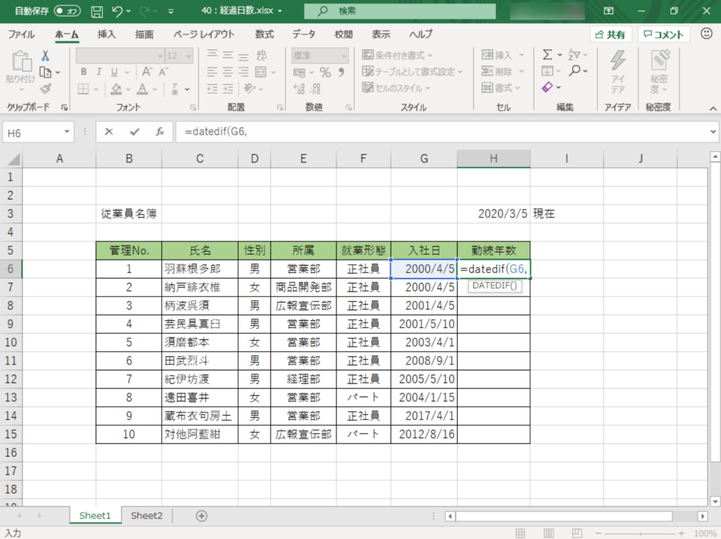 一方、DATEDIF関数は、2つの日付の差を計算する関数です。例えば、DATEDIF(A1, B1, "D")