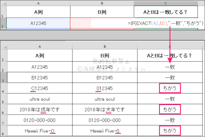 この方法の利点は、EXACT関数が大文字と小文字を区別するため、文字列の比較が非常に厳密になることです。また、IF関数を使用することで、条件に基づいてさまざまな値やメッセージを返すことができます。ただし、この方法では、EXACT関数が完全に一致するかどうかを判断するため、部分一致の場合は使用できません。