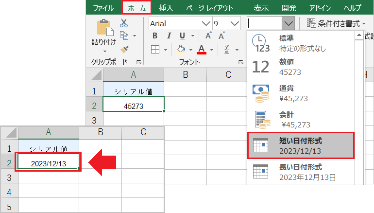 セルの書式設定を変更してシリアル値を日付に変換する方法