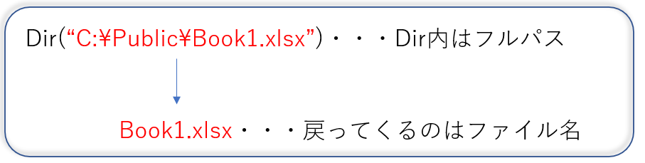 Dir関数は、指定したパスのファイル名やディレクトリ名を返す関数です。この関数を使用することで、指定したフォルダ内のファイル名を取得することができます。たとえば、Dir("C:UsersusernameDocuments*.xlsx") と記述すると、C:UsersusernameDocuments フォルダ内の .xlsx ファイルのファイル名が返されます。