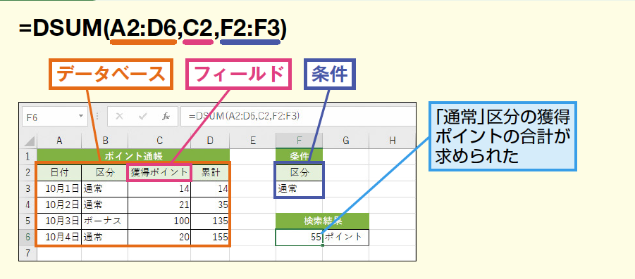 です。ここで、データベースはデータの範囲を指定し、フィールドは合計する列を指定し、条件範囲は条件を指定する範囲です。