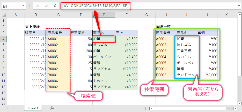 VLOOKUP関数は、別シートの表から特定の条件に一致する値を検索し、反映させることができます。VLOOKUP関数の基本的な構文は、VLOOKUP(検索値, 検索範囲, 列番号, 範囲内検索)です。検索値は、別シートの表で検索する値を指定します。検索範囲は、別シートの表で検索する範囲を指定します。列番号は、検索した値を返す列の番号を指定します。範囲内検索は、検索範囲内で検索するかどうかを指定します。