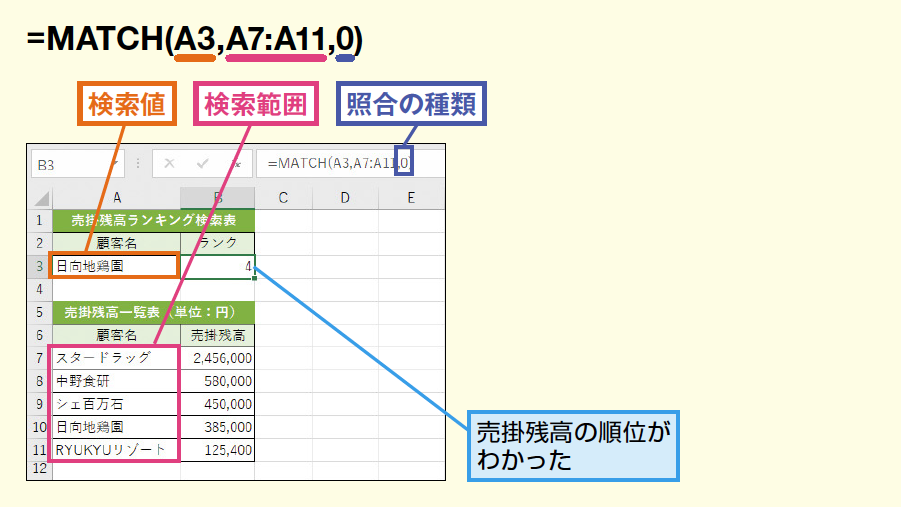 この関数は、指定した値が検索範囲内に存在する場合、その値の位置を返します。たとえば、検索値が「東京」で、検索範囲がA1:A10の場合、A1:A10の範囲内に「東京」が存在する位置を返します。