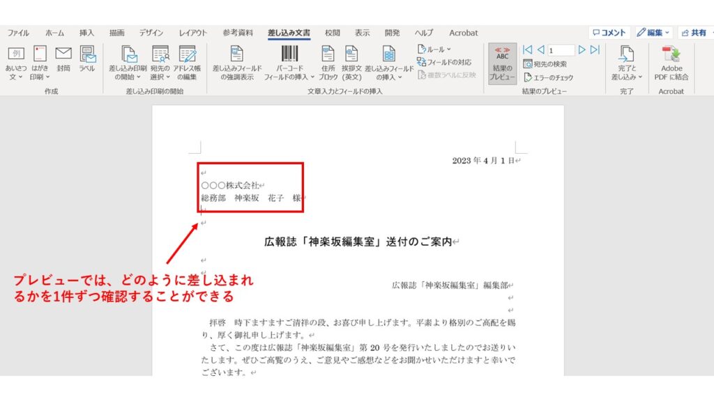 この機能は、企業や組織で頻繁に使用される文書の作成に非常に役立ちます。例えば、顧客へのメールや請求書、社員への通知などを自動的に作成することができます。また、差し込み印刷は、Word 文書の作成にのみ使用されるわけではありません。Excel データを用いて、PowerPoint のプレゼンテーションや Outlook のメールも自動的に作成することができます。