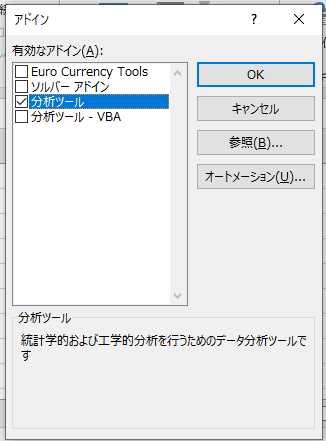 この問題を解決するには、アドインを有効にする必要があります。Excelの「ファイル」メニューから「オプション」を選択し、「アドイン」をクリックします。次に、「アドインの管理」をクリックし、「分析ツールパック」を選択します。最後に、「OK」をクリックして、アドインを有効にします。