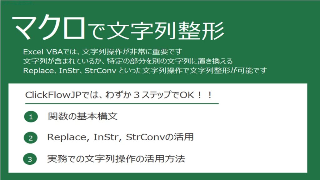 REPLACE関数を使用することで、Excel VBAで文字列の一部を別の文字列に置換することができます。REPLACE関数の基本的な使い方は、Replace(文字列, 開始位置, 置換する長さ, 置換後の文字列) です。この関数を活用することで、繰り返しの作業を自動化し、効率的なデータ処理が可能になります。