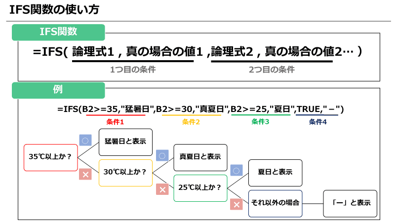 この式では、A1セルの値が80以上の場合、"優秀"という文字列が返されます。そうでない場合、"合格"という文字列が返されます。ここで、A1セルの値が条件であり、"優秀"と"合格"がそれぞれ TRUE と FALSE の場合の処理です。