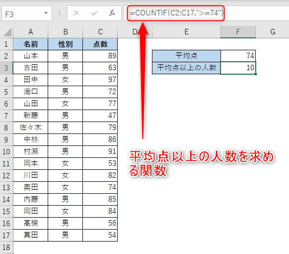と指定することで、特定の科目で特定の点数以上の生徒数をカウントできます。