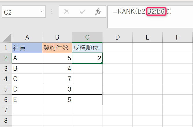 同順位のデータがあった場合、同じ順位を割り当てます。その後のデータは、順位が一つ飛ばされたものとして扱われます。たとえば、RANK関数を使用して、学生のテストの点数を順位付けする場合、同点の学生には同じ順位が割り当てられます。